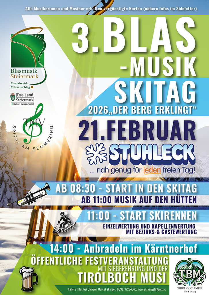 Homepage Willkommen beim TMV Spital am Semmering! Neueste Beiträge Blasmusikskitag 2026 Herbstkonzert 2025 Konzert in der Kirche 2025